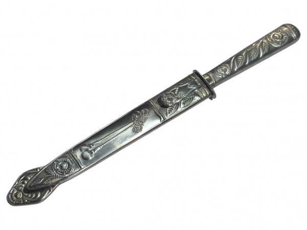 • HERCULES INOX (Fundada em 1931 por imigrantes alemães em Porto Alegre, tornou-se sinônimo de luxo e durabilidade), uma (1) faca dita de GAÚCHA, confeccionada em aço inox, rico cinzelado de elementos florais, cordas e estribo, acondicionada em caixa original com desgastes, medindo 29cm.