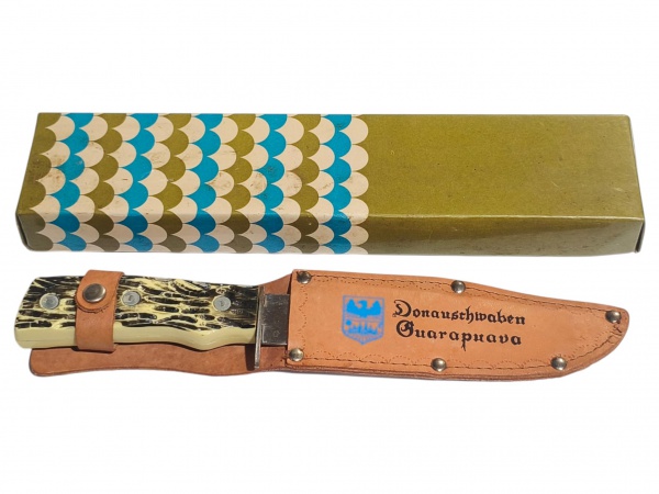 • CUTELARIA, uma (1) faca da manufatura TRAMONTINA, lâmina em aço inox com gravação da colônia Donaustwaben, localizada em Guarapuava, Paraná (bainha também marcada), cabo sintético imitando madeira, com bainha em couro na tonalidade marrom, acondicionada em caixa original com marcas de uso, medindo 27,5cm de comprimento.