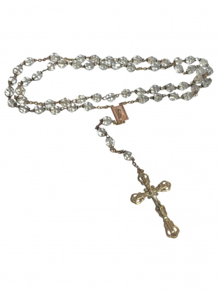 • ARTE SACRA, um (1) terço italiano com contas confeccionadas em cristais translucidos facetados, monture em metal dourado, crucifixo cinzelado em vazados com inscrição ROMA no verso, apresenta falhas na douração, medindo 61cm de comprimento.