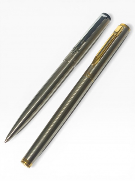 • CANETAS, lote com duas (2) canetas esferográficas com corpo confeccionados em aço escovado, sendo 1 da manufatura CROWN, ambas necessitam de nova carga.