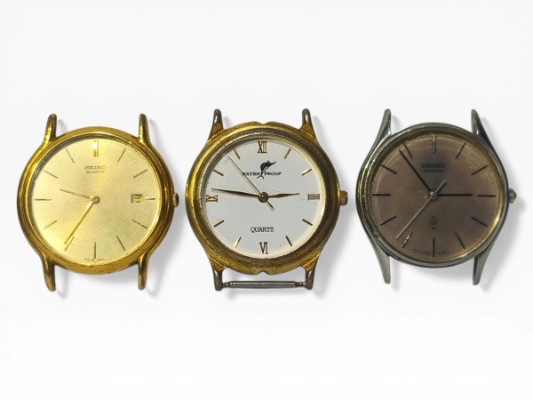 • RELÓGIOS, lote com três (3) relógios de pulso, sendo: A) 2 SEIKOS QUARTZ, 1 com caixa em metal dourado e outro em metal prateado, ambos com marcas do tempo no mostrador e ausência da pulseira (1 falta ponteiro de segundos), vendidos no estado, medindo 3,5c, e B) 1 WATERPROOF, caixa em metal dourado com sinais de oxidação, movimento quartz, ausência da pulseira e vendido no estado, medindo 3,5cm.