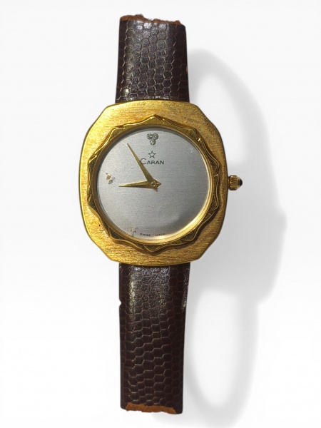 • RELÓGIO, um (1) relógio de pulso, da marca CARAN, caixa confeccionada em metal dourado, fundo prateado com incrustação de pedrarias translucidas, necessita troca da pulseira, não testado e sem garantia de funcionamento, caixa medindo 3x3,5cm.