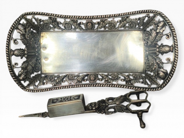 • PRATA DE LEI, uma (1) espevitadeira, confeccionada em PRATA DE LEI, contrastada F.D.G. (possivelmente Francisco Duarte da Graça, é frequentemente acompanhada por contrastes ou marcas falsas/pseudo-contrastes da época, como o Porto Coroado, que eram utilizados para indicar a procedência e qualidade da peça), ricamente cinzelada por guirlanda floral em vazados, borda em gomos torcidos e pés finalizados em garra, medindo 4,5x22x10,5cm e peso 375g.