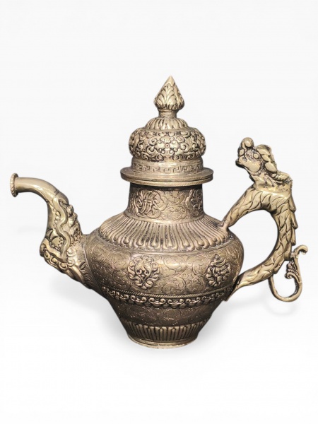 • METAL PRATEADO, um (1) bule para chá, confeccionado em metal espessurado a prata, ricamente cinzelada por elementos vegetalistas, gregas, caneluras e gomos, alça no feitio de cão de fó e pega da tampa no feitio de pinha, medindo 22x23x7,5cm.