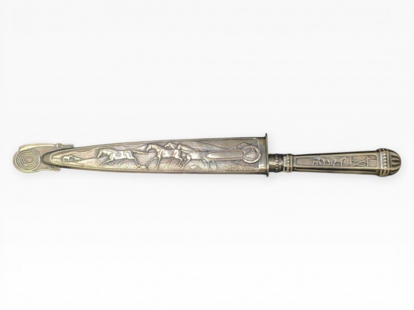 • CUTELARIA, uma (1) faca dita de GAÚCHA, lâmina em aço inox, possui marca da manufatura ELMO INOX (uma empresa familiar com mais de 30 anos, fundada por Eduardo da Cunha, especializada em facas, canivetes e utensílios de corte feitos à mão combinando tradição e tecnologia moderna), cabo e bainha, confeccionados em metal espessurado a prata com primorosa ornamentação com cenas de cavalos, lâmina lisa, medindo com bainha 32cm de comprimento.