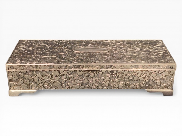 • METAL PRATEADO, um (1) porta maço de cigarro, confeccionado em metal espessurado a prata de origem alemã, ricamente cinzelado por cena de campo em relevo, apresenta falhas na prateação, medindo 9x6cm