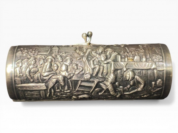 • METAL PRATEADO, uma (1) bolsa porta níquel, confeccionada em metal espessurado a prata, ricamente cinzelado por cena campestre em relevo, banho em excelente estado, medindo 3x9cm.