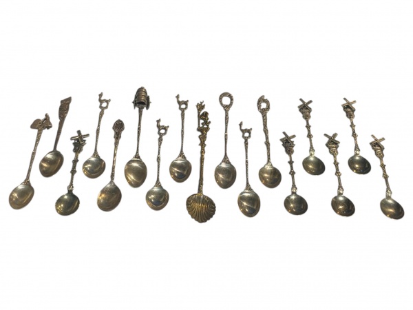 • METAL PRATEADO, dezessete (17) colheres para café de coleção, confeccionadas em metal espessurado a prata, de modelos, tamanhos e decorações distintas.