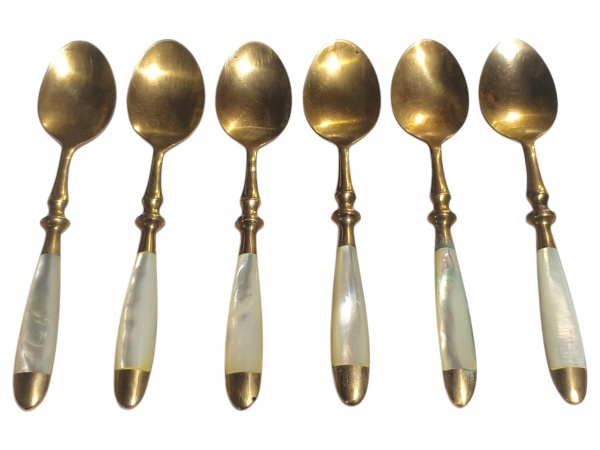 • METAL DOURADO, seis (6) colheres para chá, confeccionadas em metal dourado e cabos com incrustações de madre pérola.