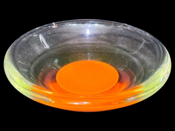 • MURANO, um (1) pequeno centro de mesa, confeccionado em vidro de Murano translucido com fundo na tonalidade abóbora, medindo 5x16cm.