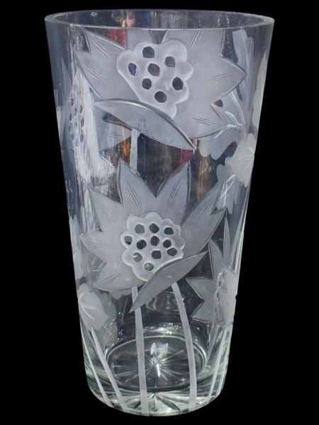 • CRISTAL, um (1) vaso cilíndrico, confeccionado em cristal translucido, com lapidação de flores e folhagens em baixo relevo fosco, apresenta bicados na borda e batidas laterais, fundo estrelado, peça medindo 30x17cm.