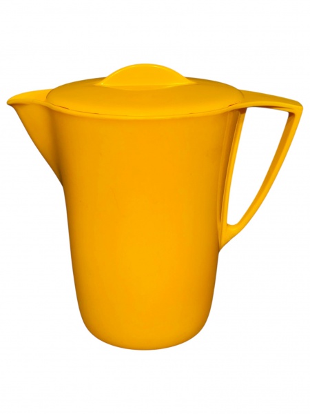 • DIVERSOS, uma (1) jarra confeccionada em melanina na tonalidade amarela da manufatura GOYANA, medindo 19x20x13cm, apresenta desgastes na tampa.