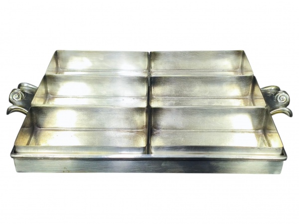 • METAL PRATEADO, uma (1) petisqueira com seis divisórias, reversível para bandeja, confeccionada em metal espessurado a prata, alças laterais cinzelada por volutas, apresenta falhas na prateação, marcação no fundo, medindo 37x25cm.