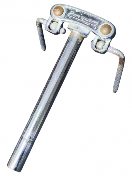 • INSTRUMENTO MUSICAL, um (1) suporte duplo longo para tons da marca PINGUIM, confeccionado em metal cromado com sinais de oxidação, medindo 28x17,5cm.