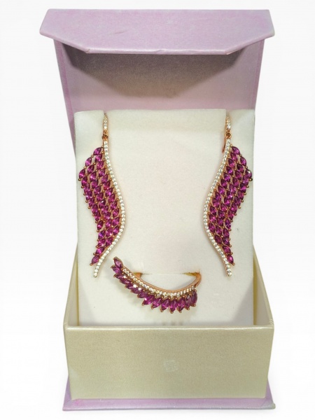 • JOIAS, conjunto com três (3) peças, sendo: A) 1 par de brincos para orelha furada, medindo 6,5cm, e B) 1 anel, aro 27, confeccionados em PRATA DE LEI dourada, ricamente incrustados por ametistas, em excelente estado de conservação. Peso total bruto 16,2g.