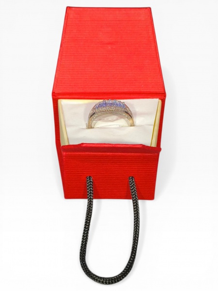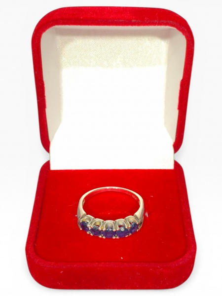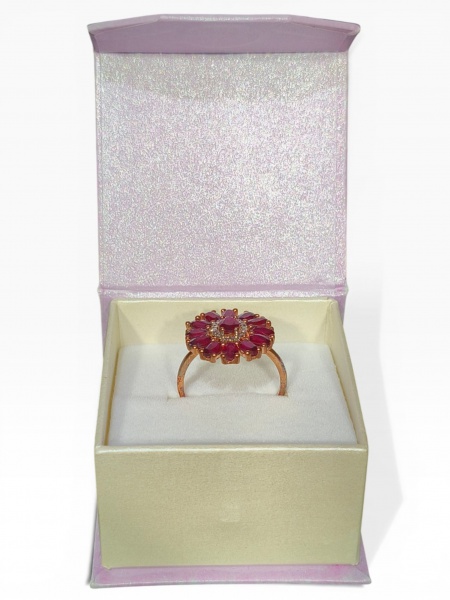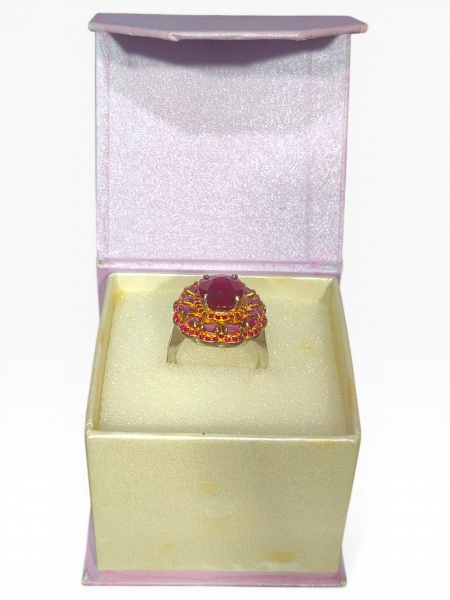 • JOIA, um (1) anel, confeccionado em PRATA DE LEI, contrastado 925, frontal em douração, possivelmente vermeil, com incrustação de ametistas, pedras rosadas e uma vermelha ao centro, peso total bruto 7g e aro 18.