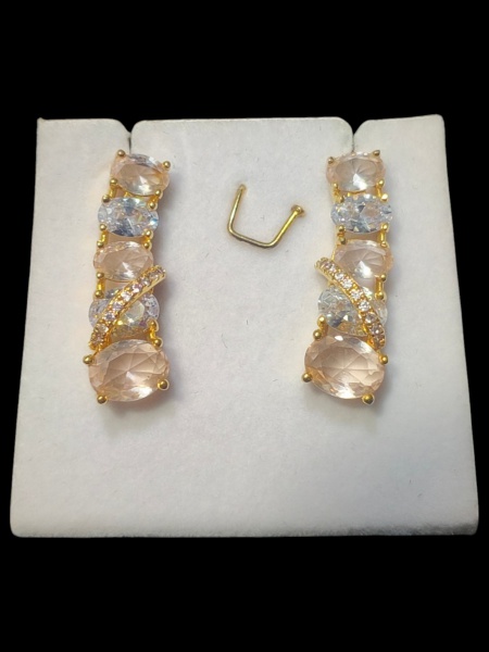 • BIJUTERIA FINA, par (2) de brincos para orelha furada, confeccionados em metal dourado, com incrustações de cristais translúcidos, medindo 2,5cm.
