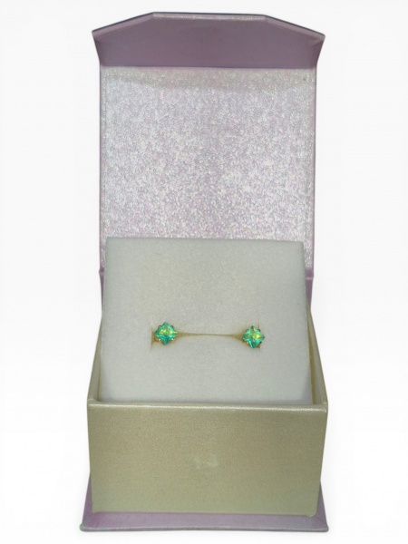 • BIJUTERIA FINA, par (2) de brincos para orelha furada, confeccionados em metal dourado, incrustado por pedra na tonalidade verde, medindo 0,3cm.