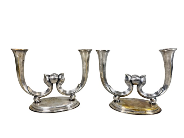 • METAL PRATEADO, par (2) de candelabros para duas velas da manufatura EBERLE, confeccionado em metal espessurado a prata, hastes curvas no feitio de arabesco com esfera central, apoiada sobre base oval e escalonada, apresentando falhas no banho, medindo 20x24,5cm.