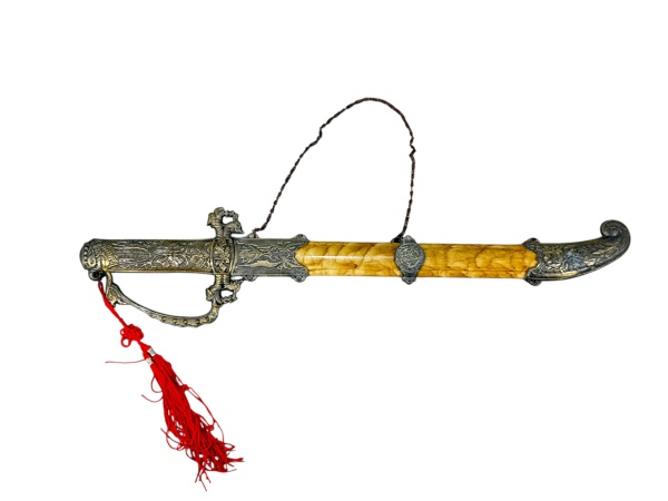 • CUTELARIA, uma (1) espada oriental decorativa com bainha, apresentando empunhadura e guarda em metal dourado ricamente ornamentado, bainha com decoração marmorizada, ponteiras em metal trabalhado, corrente de suspensão e borla em fios vermelhos. lâmina em aço inox com gume, porém, necessita amolar, medindo 50cm de comprimento.