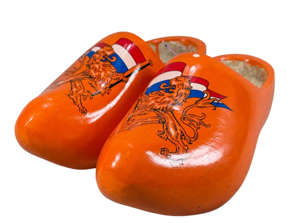 • COLECIONISMO, par (2) de sapatas holandesas (conhecidos como klompen, são tamancos tradicionais de madeira usados desde a Idade Média (século XIII) na Holanda), confeccionada em madeira com pintura na tonalidade abóbora, decorado por leão (símbolo histórico da Holanda) segurando a bandeira do país, marcação interna 26, medindo 13x31x10cm.