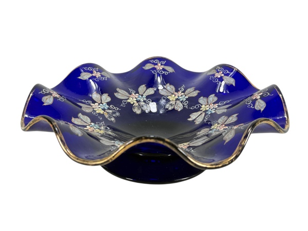 • VIDRO, uma (1) fruteira circular confeccionada em vidro na tonalidade azul cobalto, ricamente decorada por guirlanda de flores e folhagens em policromia, borda em ondulações com filete em ouro, apresenta falhas na douração, medindo 8x25,5cm.