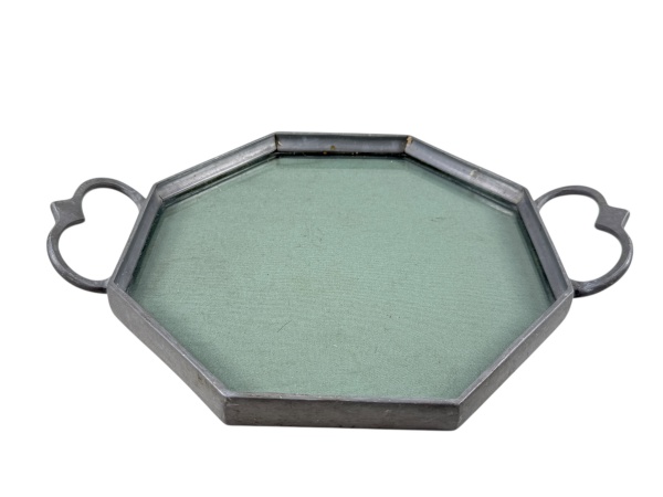 • ESTANHO, uma (1) bandeja oitavada confeccionada em estanho, alças vazadas c/ recortes e fundo em vidro na tonalidade fume, medindo 33x24,5cm.