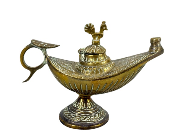 • BRONZE, uma (1) lamparina confeccionada em bronze, ao gosto oriental, modelada no formato navicular, com tampa articulada encimada por figura de galo, bico alongado, cabo vazado e base circular. Peça com cinzelados geométricos, medindo 10x13,5cm.