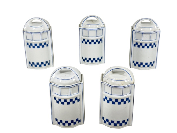 • PORCELANAS, cinco (5) porta temperos confeccionados em porcelana na tonalidade branca com recortes na borda, decorado por quadriculados na tonalidade azul, alça vazada, leves marcas do tempo na tampa e 1 com fio de cabelo, medindo 11x6x6cm.
