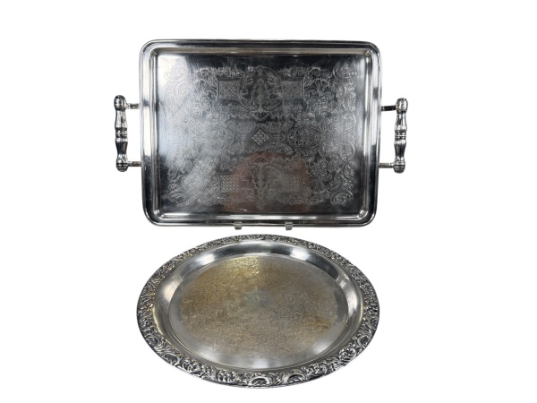 • METAL PRATEADO, lote com duas (2) bandejas confeccionadas em metal espessurado a prata, sendo: A) 1 retangular, da manufatura BEL PRATA, cinzelada por elementos vegetalistas, alças torneadas em perolados, medindo 49x32,5cm e B) 1 redonda, cinzelada por elementos vegetalistas, bordas em concheados e folhagens, apresenta falhas na prateação, medindo 31cm de diâmetro.