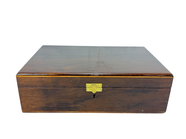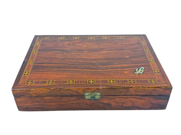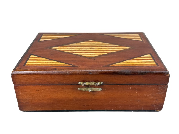 • DIVERSOS, uma (1) grande caixa retangular confeccionada em madeira, decoração em marchetaria geométricas de tonalidades distintas, fecho em metal prateado com quebra, interior em veludo na tonalidade verde, apresenta pequenos desgastes na madeira e no veludo, medindo 12x35x25cm.