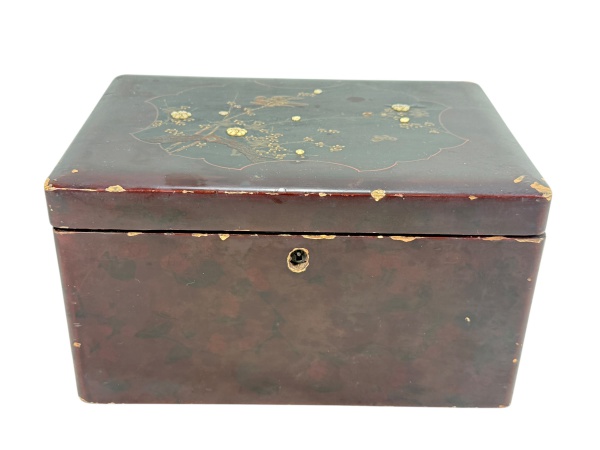 • DIVERSOS, uma (1) caixa porta joias confeccionada em madeira laqueada em tom escuro, tampo com marchetaria representando arvore, elementos florais, borboletas e pássaros em metal dourado com incrustações de flores em madre pérola e marfim, desgastes na laqueação, vide foto, interior com duas caixas removíveis, com puxadores em PRATA DE LEI representando borboletas, medindo 14x25,5x18,5cm.