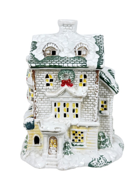 • ESCULTURA, uma (1) escultura confeccionada em biscuit representando, pintura em policromia, detalhes em relevo, cobertura simulando neve e janelas vazadas, medindo 18x13x15cm.